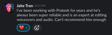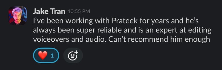 "Prateek has been an essential part of our workflow, fast, reliable, and makes our VOs sound broadcast-ready."